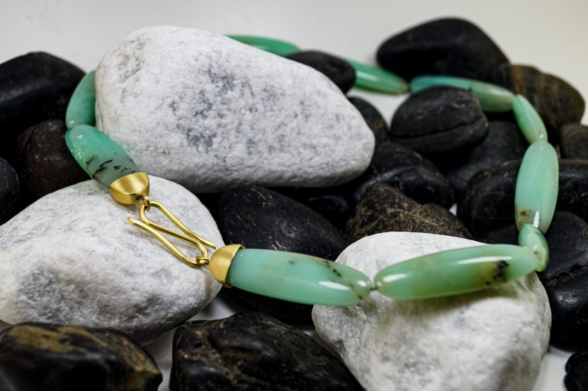 Ein natürlicher Chrysopras verarbeitet zu einer wunderschönen Kette. In 18 Karat Gelbgold gearbeiteter Hakenverschluss vollendet das Kunstwerk.