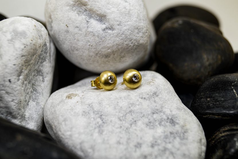 Ohrstecker gearbeitet in 18 Karat Gelbgold mit einem „eingeriebenem“ Diamanten im Brilliantschliff.