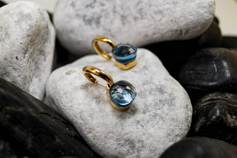 Creolen gearbeitet in 18 Karat Rotgold mit einem wunderschön blauem Topas. Die Creole kann ganz einfach auch ohne Stein getragen werden. Ob schlicht oder elegant mit Topas, alles ist möglich.